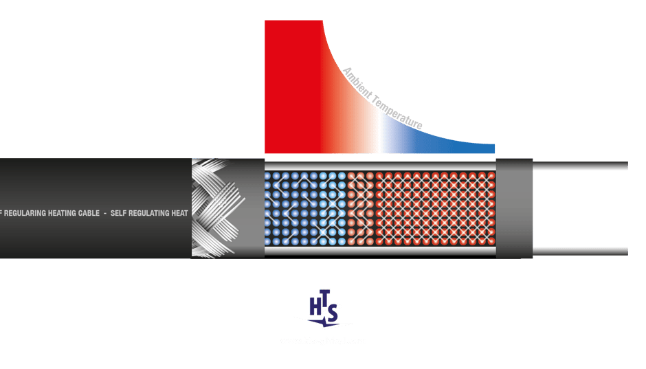 Self-regulating heating tapes consists of two parallel buswires, embedded in a semi-conductive self-regulating matrix. This means that the heating cable automatically responds to changes in ambient conditions. With increase in temperature, the synthetic material expands by molecular force, and the connections between the carbon particles diminish. This is reducing the load of the heating cable. Conversely, as the temperature decreases, the load increases as the connections between the carbon particles increases accordantly. Thus, the heating power varies according to the temperature of the surface the heating tape is applied to. Self-regulating heating tapes will not overheat or burnout - even when overlapped.